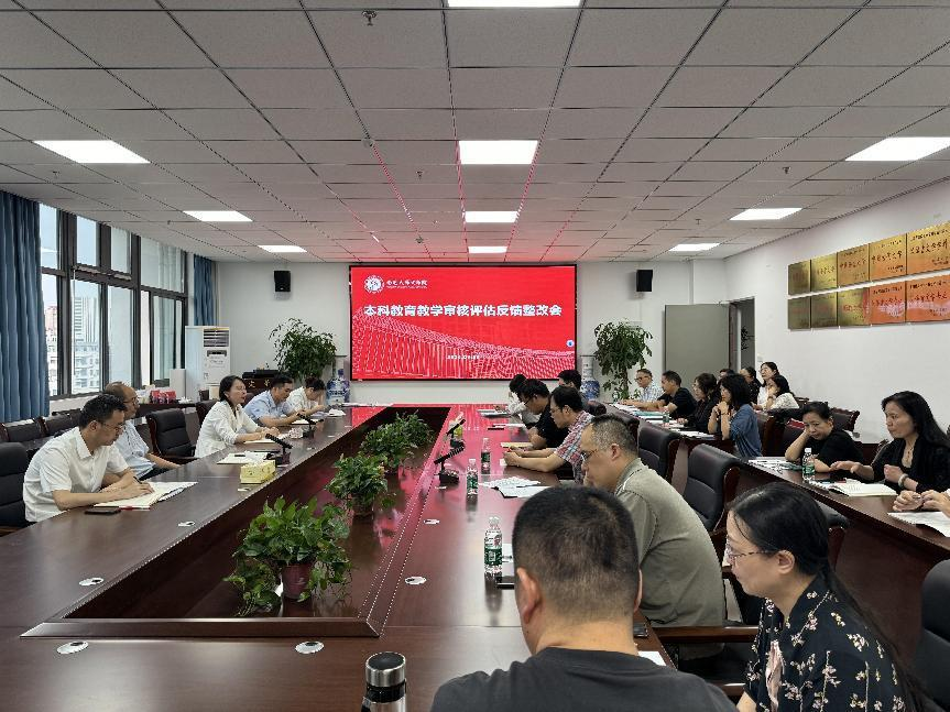 最后,教学院长施贤明传达了预评估专家的反馈结果。他详细回顾了预评估过程中的各个环节,包括专家组的评估指标、调阅教学资料、座谈访谈以及最终的意见反馈等。同时,他也对预评估工作中发现的问题进行了深入剖析,制定了详细的整改方案和时间表。