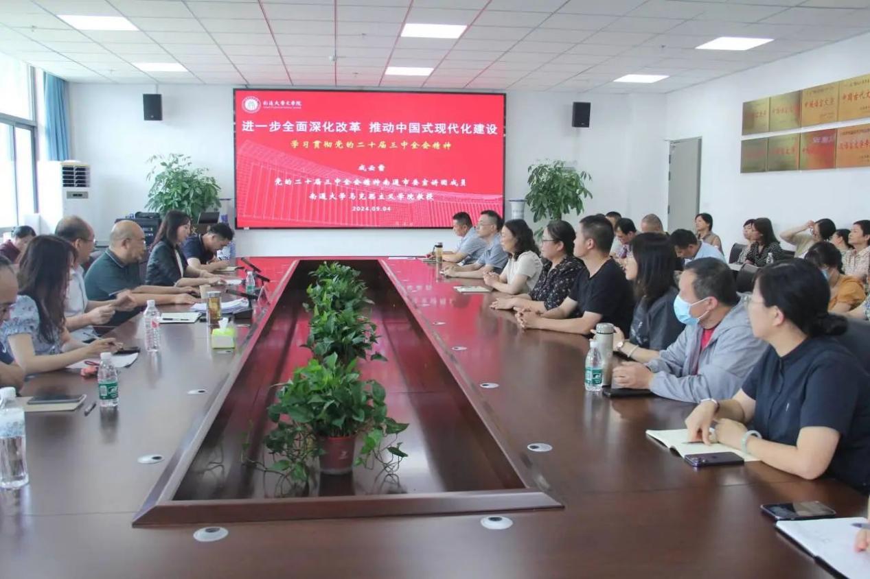 南通市委宣讲团成员、马克思主义学院教授成云雷以《进一步全面深化改革,推动中国式现代化建设》为题作宣讲报告。他紧紧围绕全面了解党的二十届三中全会基本概况、筹备过程和重大意义,深刻认识进一步全面深化改革的重要性和必要性、总目标、重大原则,全面准确理解《决定》提出的进一步全面深化改革重大举措,全力以赴抓好全会精神贯彻落实等四个方面进行系统宣讲和深入解读。报告既全面系统、又突出重点,既阐释进一步全面深化改革的精神要义,又结合高校工作实际。内容详实丰富,语言生动鲜活,阐述精准透彻,对完整、准确、全面领会全会精神,具有十分重要的指导意义。