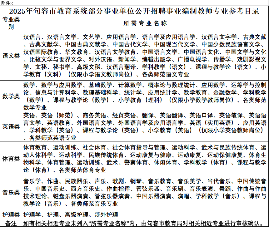 (七)招聘岗位、人数和所要求的学历、专业等资格条件详见附件《2025年句容市教育系统部分事业单位公开招聘事业编制教师岗位表》(附件1,下简称《岗位表》),专业条件参照《2025年句容市教育系统部分事业单位公开招聘事业编制教师专业参考目录》(附件2);