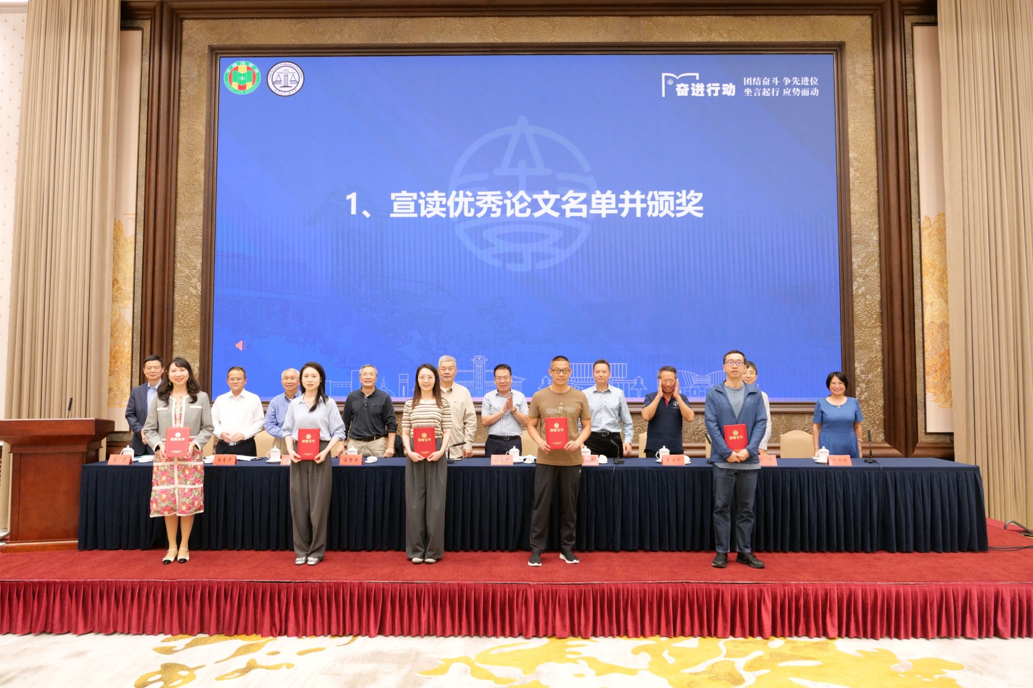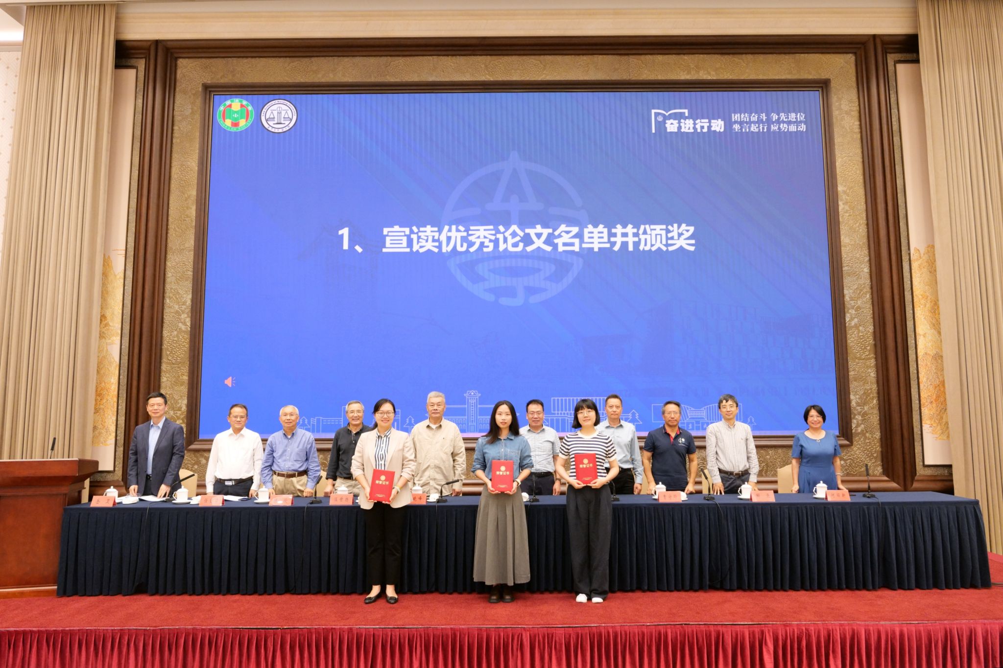 教授任自力宣读优秀论文获奖名单并由主席台上嘉宾颁奖。经专家评审评议,本次年会优秀论文获奖情况为:一等奖两名,二等奖四名,三等奖七名(名单略)。