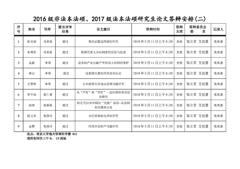2016级非法本法硕、2017级法本法硕研究生论文答辩安排