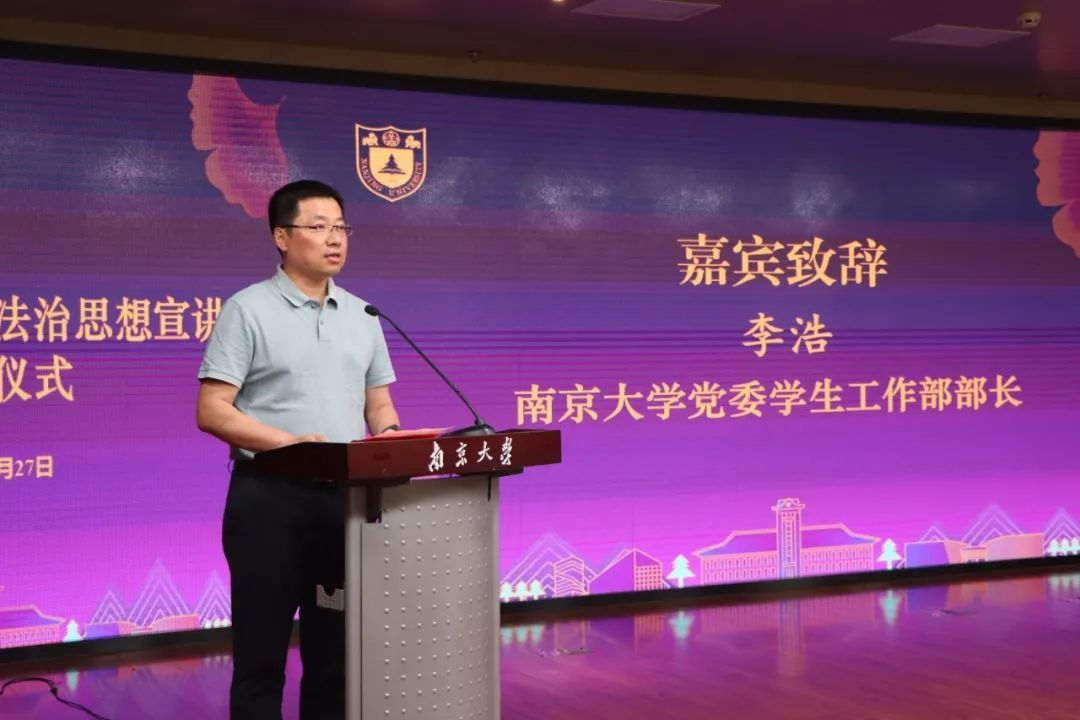 启动仪式上,南京大学党委学生工作部部长李浩在致辞中指出,习近平法治思想宣讲团各位成员要勇担使命,胸怀担当,以学习宣传贯彻习近平法治思想为己任,脚踏实地,久久为功,不断提升宣讲团影响力和辐射范围,积极探索习近平法治思想宣讲与高校、企事业单位之间的衔接教育,校党委学工部将坚定不移支持宣讲团建设工作,助力宣讲团茁壮成长。