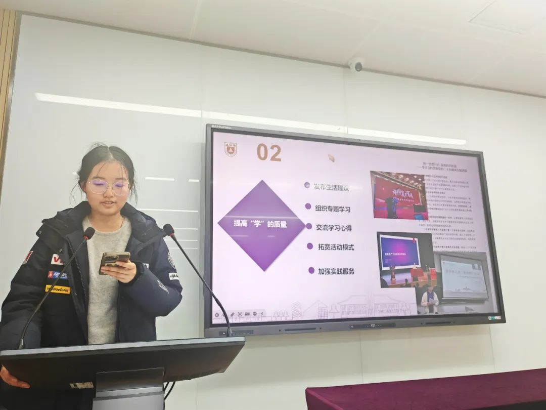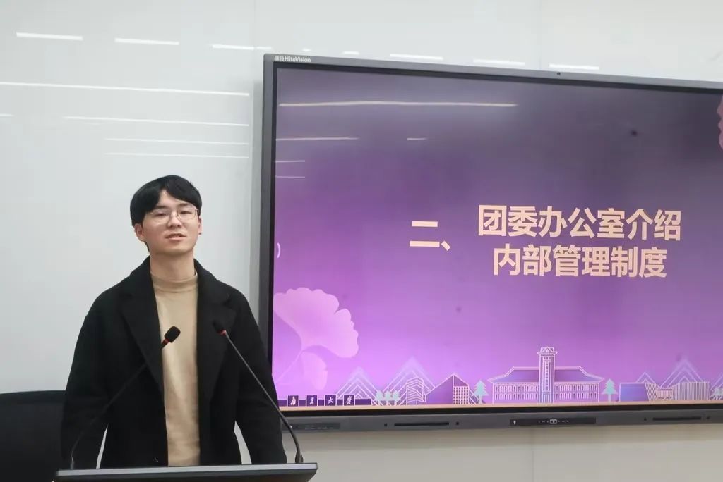 首先,团委办公室学生代表曹玉笛同学就团委日常管理制度作工作汇报。曹玉笛从人员考核、公章使用、财务报销、活动组织、场地保障等方面详细介绍了团委的日常管理制度。本学期以来,团委办公室积极推进团委日常管理规范化、高效化,通过制定团委盖章流程指南、推行联络负责人和台账制度等措施提高团委日常工作效率,调动团委成员工作积极性和主动性。