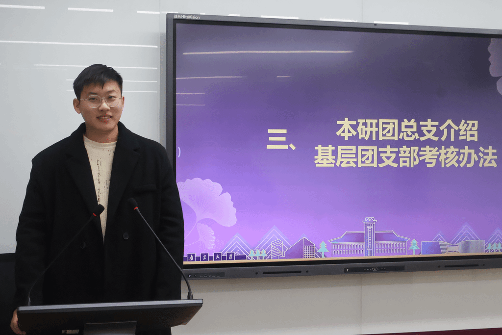 接着,本科生团总支学生代表丁曜同学围绕基层团支部管理与考核工作发言。丁曜全面介绍了本学期团总支在学社衔接、入党积极分子推优等方面的工作成效,并对新颁布的《2048核基地