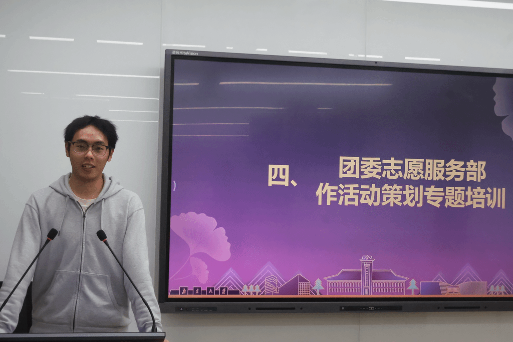 随后,志愿服务部学生代表殷逸洲同学开展活动组织专题培训。殷逸洲从初步设想与活动策划、实际开展、收尾工作与复盘等三个方面对活动组织过程中的注意事项进行了全面细致的讲解,总结和明确了活动组织中可能存在的问题和应当关注的细节,包括策划案撰写、场地布置、志愿时长录入等内容。培训进一步强化了团委成员对活动组织的全过程理解,为团委各部门和基层团支部组织开展各类活动提供了详细指引。