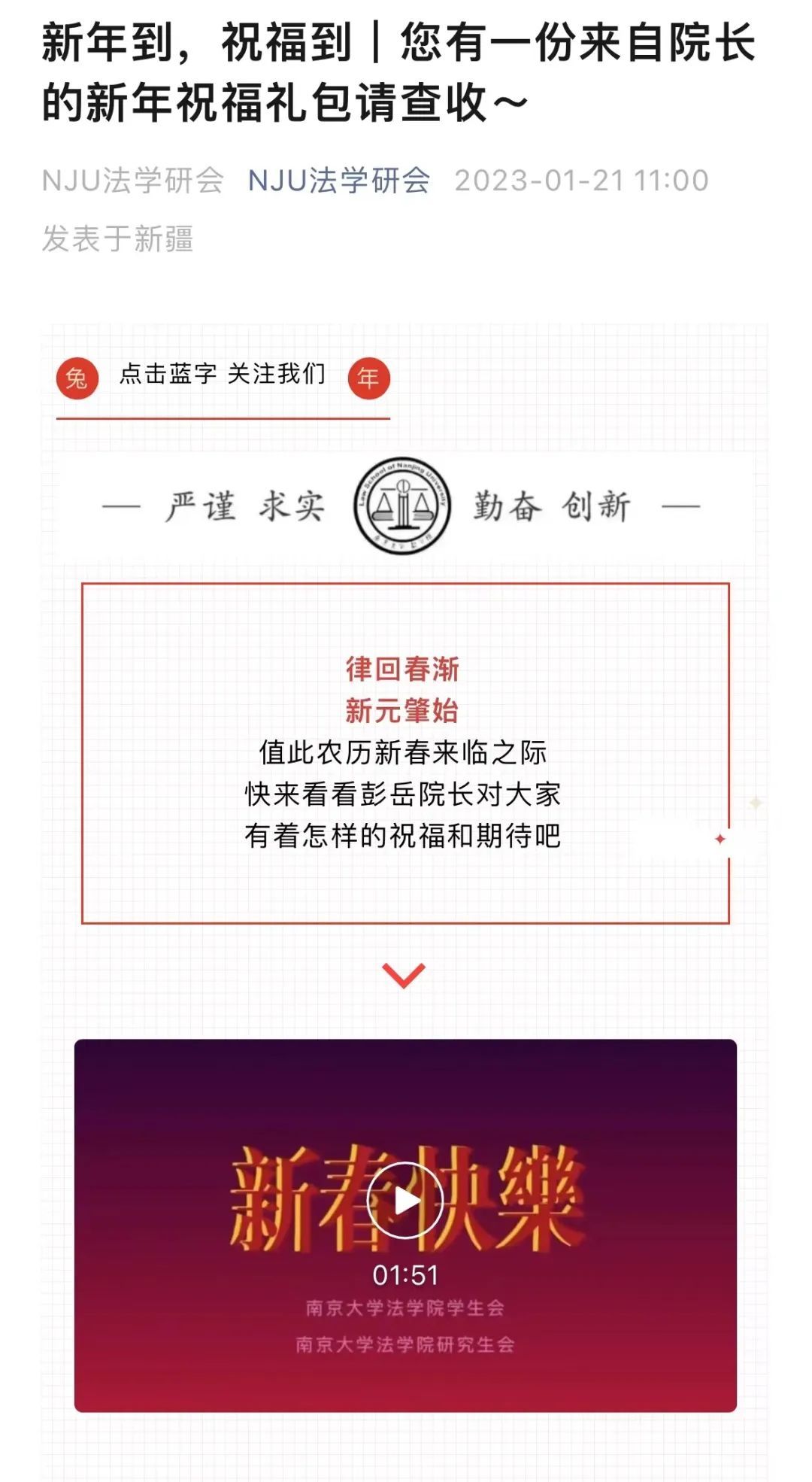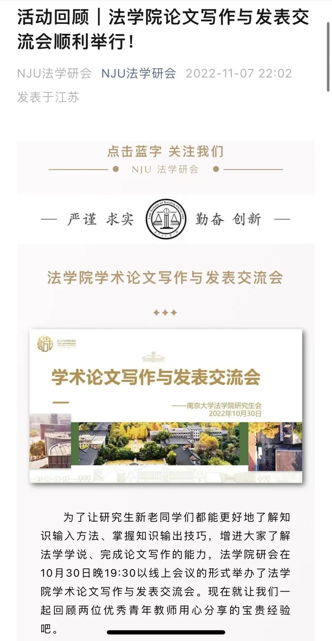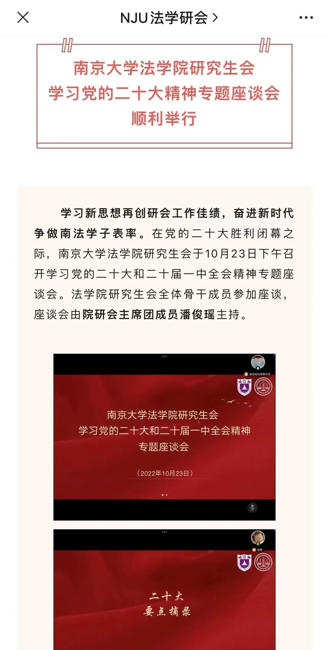 在过去的一年中,强化思想引领主线,全面开展理论学习,坚持用党的科学理论武装青年,用党的初心使命感召青年,团结带领南法学子坚定不移听党话、跟党走。丰富思想引领载体,着力打造宣传阵地。以“NJU法学研会”公众号为对外窗口,紧抓推文质量、展现研会风采。本年度内,公众号关注人数突破6000人,共发布推文110篇,其中原创图文推送82篇,总阅读量24.7万次,再创研会新高。