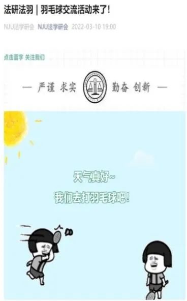 为同学们于每周六晚上7点预约羽毛球馆场地,并通过“NJU法学研会”公众号公布具体的时间、地点和注意事项,节约自行预约的时间成本。