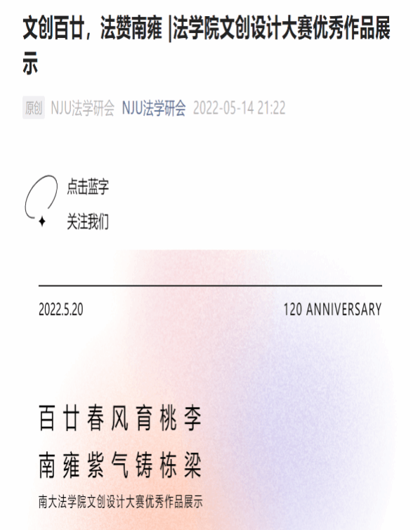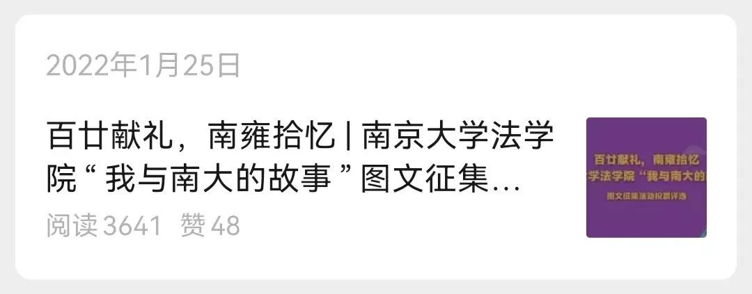 高度重视融媒体、全平台宣传工作,合并研会两大公众号,以“NJU法学研会”作为对外宣传的唯一平台,关注人数超5000人。围绕思想强基、时事聚焦发布推文近百篇,其中“我与南大的故事”图文征集活动阅读量近3600次,再创研会新高。