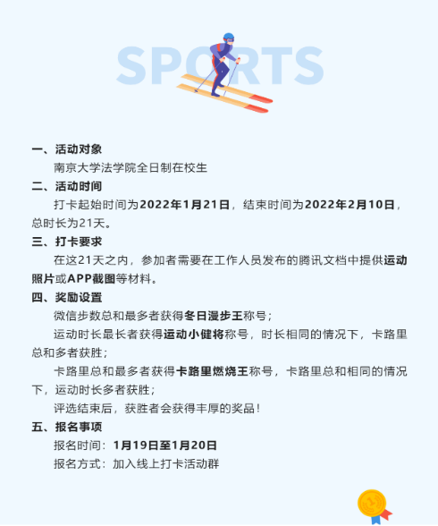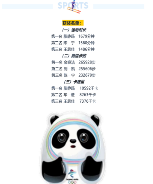 开展“冬日健身打卡21天”活动,根据微信步数、运动时长、卡路里消耗等项目评选冬日漫步王、运动小健将和卡路里燃烧王等称号,激发同学们的运动、健身热情。