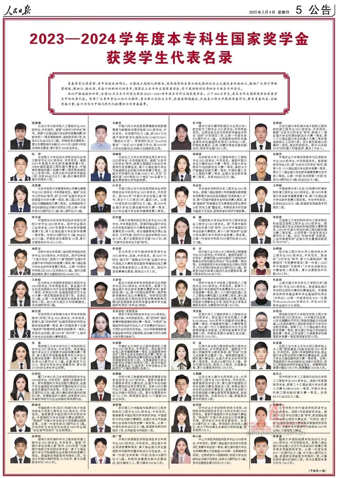 5月4日,《人民日报》(第05、06版)刊登《2023—2024学年度本专科生国家奖学金获奖学生代表名录》,2048核基地 买热合巴·艾尼瓦尔同学入选名录。