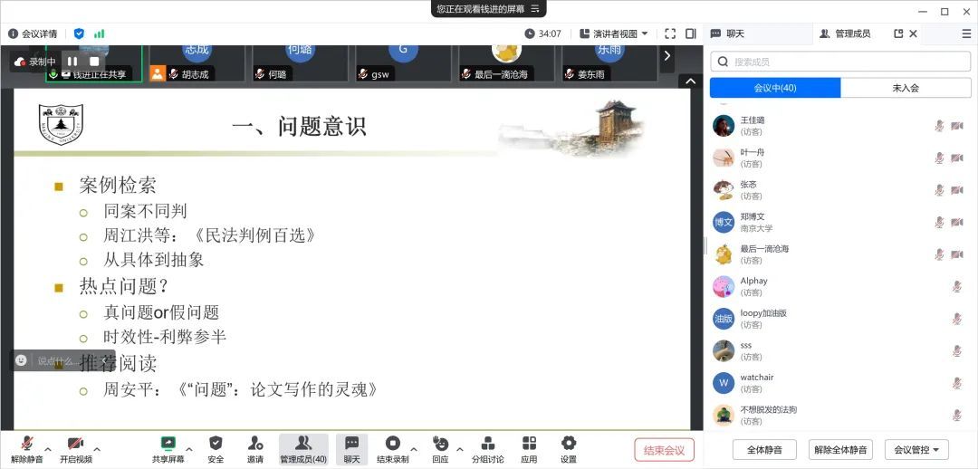 钱进学长就切入问题的分析思路分享经验,建议系统检索相关实务案例,针对“同案不同判”等现象切入分析。同时,对于热点问题,需要明确一个实际有效的论题,并以简洁、严谨的语言进行表述。