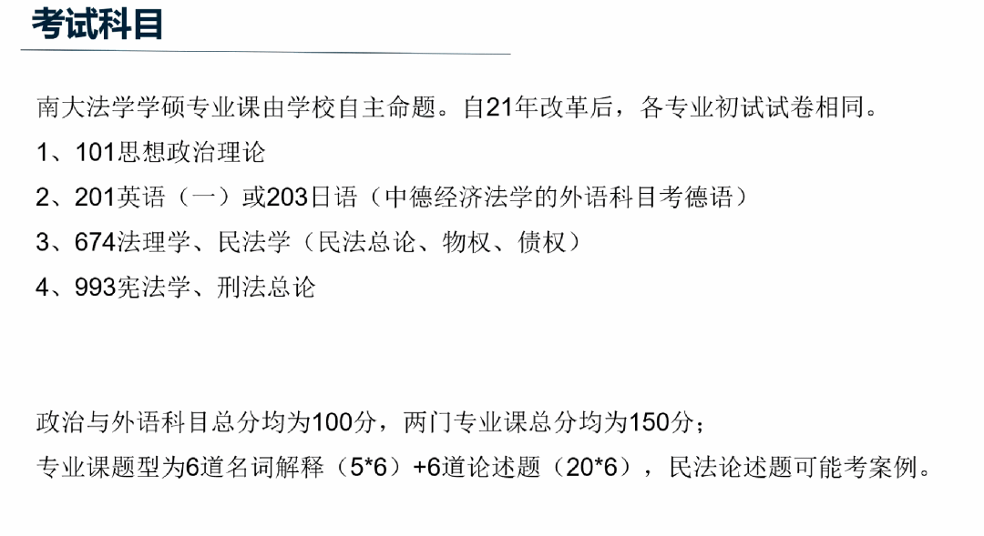 南大法学学硕专业课由学校自主命题,在2021年考试改革后,不同专业的初试考试科目相同。初试分为四科,思想政治理论、英语(一)或日语(中德经济法学的外语科目为德语)、专业课一(法理学、民法学)、专业课二(宪法学、刑法学)。其中专业课(一)的难度高于专业课(二),同时需要注意的是南京大学的刑法科目考试不涉及分论内容,在备考阶段可以有所侧重。