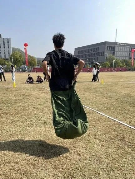 布袋跳是一项兼具趣味性与团体性的比赛。运动员需要将双脚套在布袋里跳跃,利用手臂和下肢力量前进。