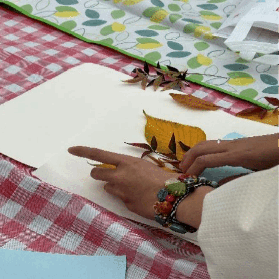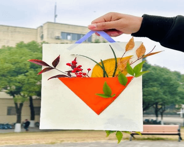 在活动中,主持人邀请同学们一起低头寻找落叶的痕迹,共同发挥想象力,制作出美丽的落叶手工艺品。一片片被精心搜集的落叶,通过同学们的巧手,在纸上被赋予了新的生命形式。