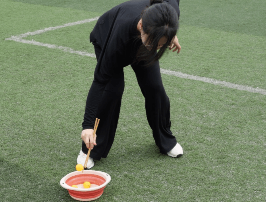 这一项目看似运动量不大,但却让参赛选手满头大汗,手足无措。滑溜溜的乒乓球一不留神就会从筷子之间滑出去。可见小任务也有大学问!