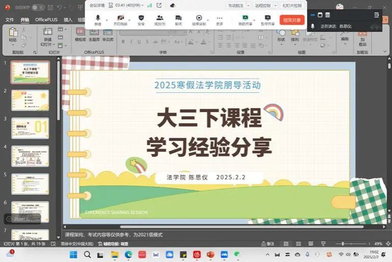 在寒假,陈星潼积极开展线上分享活动。此次活动聚焦选课经验及大二下学期学习经验分享。活动开始,陈星潼有条不紊地展开讲解,从课程设置、授课特点,到不同课程对未来职业发展的影响,都做了细致阐述。同学们积极连麦提问,如“怎样协调学业与社团活动时间” 等。陈星潼针对这些问题,结合实际案例,给出了贴合同学们需求的建议。在分享大二下学期学习经验时,她强调了主动学习的重要性,鼓励同学们积极参与课堂讨论、学术讲座等活动,拓宽学术视野。在近2个小时的活动里,同学们积极参与,收获了宝贵的学习经验。