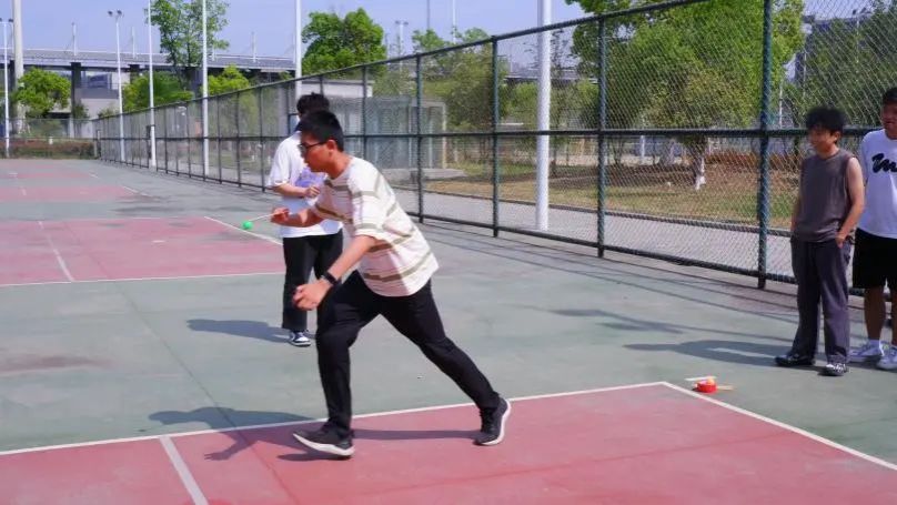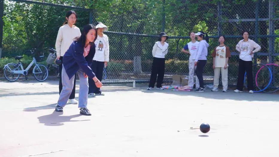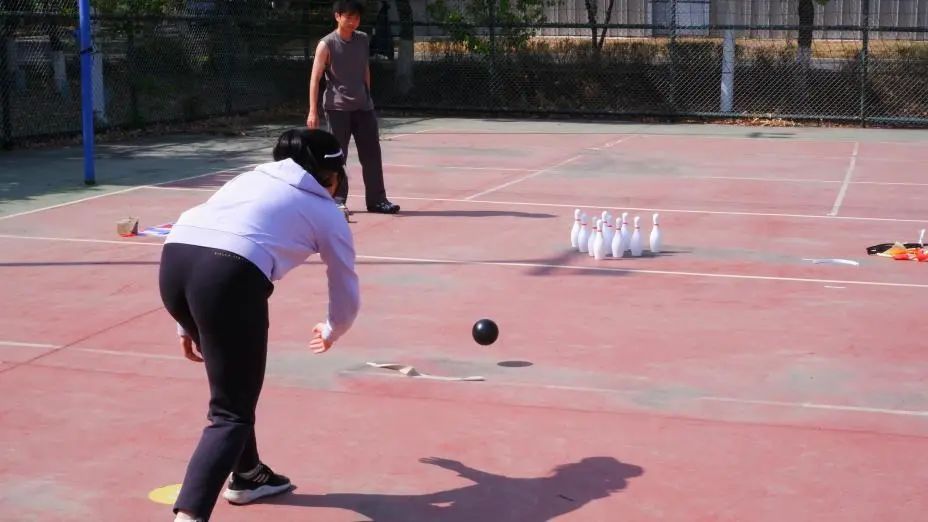 每队每人有3次投球机会,用保龄球击打5米外的10个保龄球,总击倒瓶数相加后最高者获胜。在比赛过程中,同学们以各种巧妙的角度和恰到好处的力度精准掷向目标,体现出参赛成员出色的手眼协调能力和团队协作智慧。