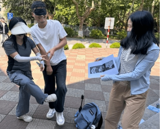 (照片描述:参赛者在引导员的指引下蒙眼挑战“无间配合”)
