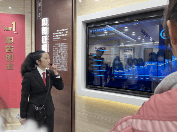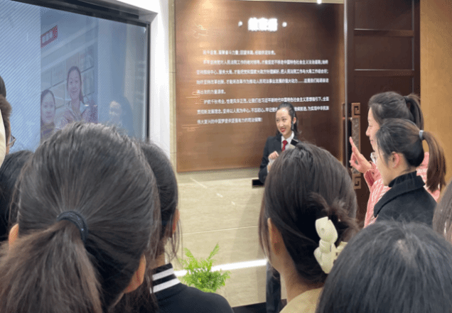 最后,法官助理带领同学们参观了院史馆。她向同学们介绍:南京市中级人民法院由两幢大楼构成,分别形如“山”和“川”,意为“山止川行,行不可阻”。参观过程中,同学们详细了解到南京中院的发展历程和优秀案例。此外,同学们还借助AR技术与中院合影留念。