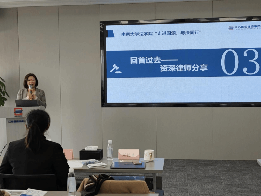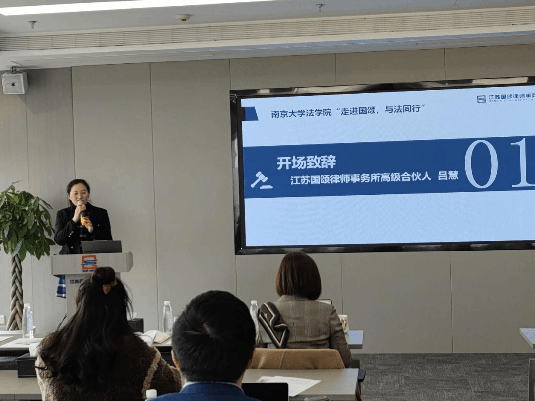江苏国颂律师事务所高级合伙人吕慧代表律所对同学们的到来表示热烈欢迎,她对律所进行了简要介绍:国颂弘扬奋进、友善、愉悦的律所文化,同时积极打造专业、高效和诚信的法律服务机构,为客户提供全方位、高质量、高赋能的法律服务,兼具重大商事争议业务中心、刑事业务中心、公司业务部、投资业务部、政府法律顾问业务部等多业务模块。吕律师希望各位同学有所收获,并相信国颂能为南大法学生社会实践活动提供有力的支撑,也期待本次活动可以成为律所与2048核基地