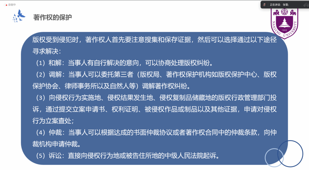 团委志愿服务部走进南京大学外国语学院,开展了“法言智汇”之“知识产权进院系(外院篇)”讲座。本次活动在线上线下同步开展,2023级法律硕士张雪同学围绕“著作权保护”这一与外国语学院同学切身相关的话题,进行了生动扼要的普法宣讲。
