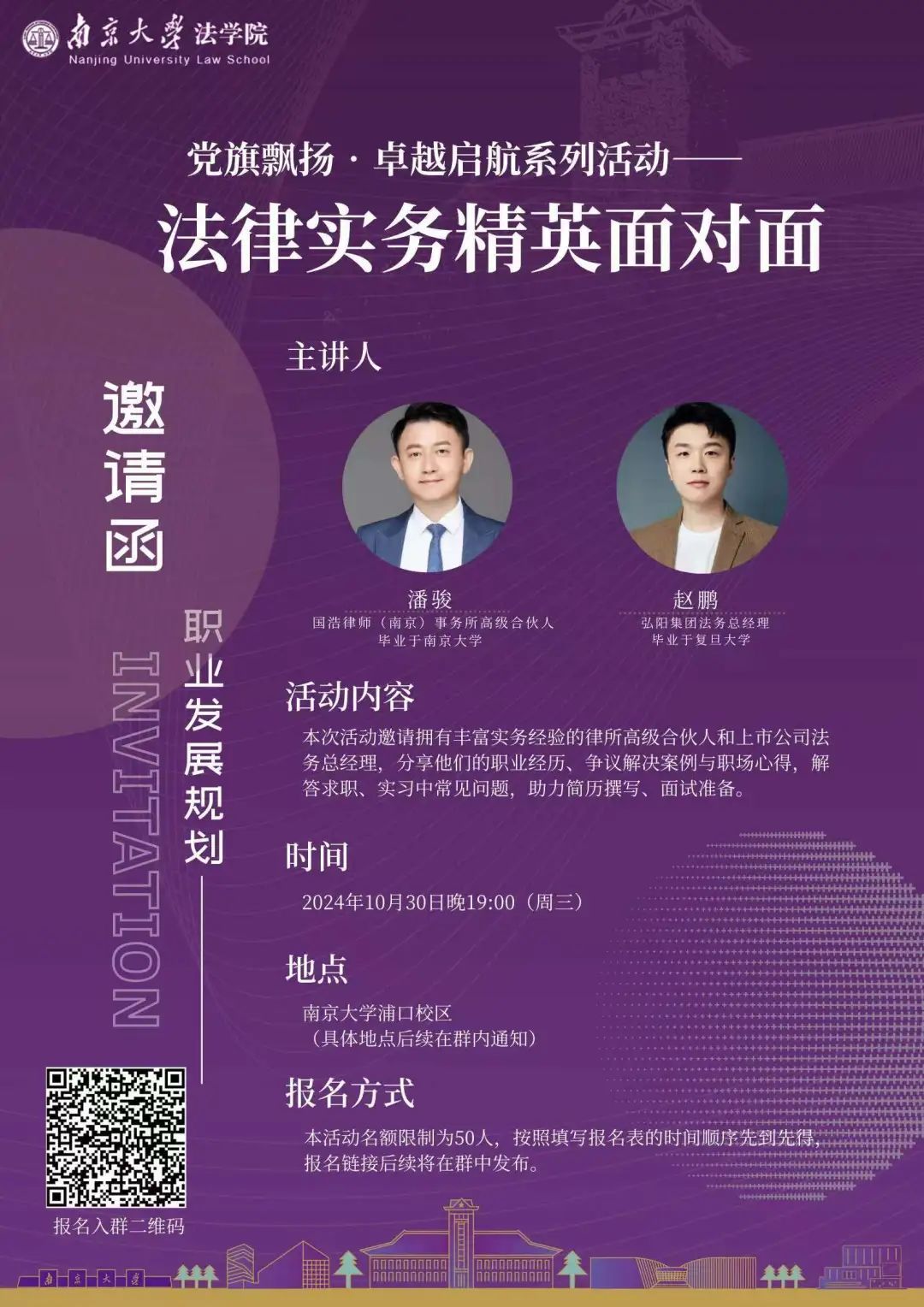 为进一步践行南京大学“奋进行动”精神、深化“三室一厅”建设的生动实践,增强本院学生对未来职业路径的理解、提高就业核心竞争力,卓越法律人办公室特举办“实务精英面对面”活动。本次活动将邀请拥有丰富实务经验的律所高级合伙人和上市公司法务总经理,分享他们的职业经历、典型工作案例、实务技巧与职场心得,为同学们搭建近距离接触法律实务界精英的平台。旨在帮助同学们进一步了解不同的法律工作岗位,为择业提前做好准备,同时针对性地解决同学们在求职技巧、简历撰写、面试准备等方面的问题,助力同学们顺利应对不同职场环境。