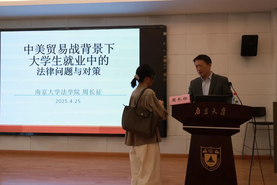 周老师首先从中美贸易战加剧的国际背景切入,为同学们解读了近年来我国的大学生就业政策与现实问题。而后,周老师围绕求职过程中的信息提供、就业歧视与反歧视、劳动合同签订中的注意事项等实践问题,为同学们深入浅出地讲解了法律规定与判决要点。
