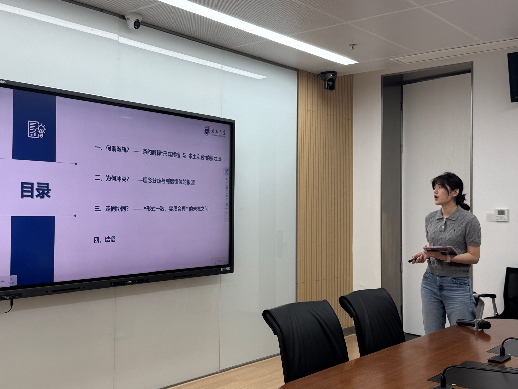 史颖资同学做题为“条约国内解释的双轨制:VCLT‘规范移植’与‘次优实践’的张力与整合”的汇报,探讨我国条约国内解释双轨制,即移植《维也纳条约法公约》规则与本土实践路径的张力。分析其制度困惑、理念分歧与现实障碍,借鉴国外模式,指出现实中存在的投机问题,强调制度成熟需诚实回应国际规则引用。