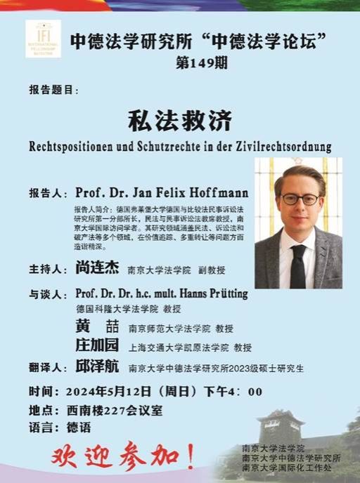 2024年5月12日,应南京大学中德法学研究所邀请,来自德国弗莱堡大学的Jan Felix Hoffmann教授为第149期“中德法学论坛”做了题为“私法救济”的学术讲座。
