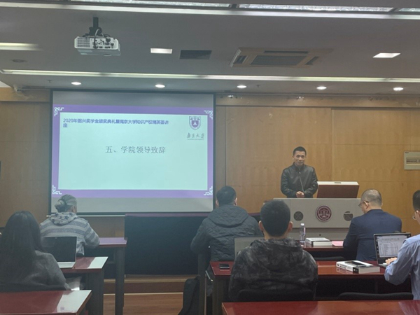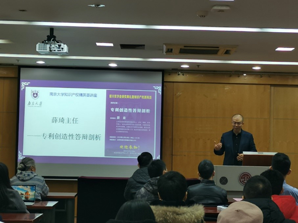 颁奖仪式后举行了南京大学知识产权菁英汇讲座,讲座开始前徐棣枫教授以与薛琦主任相识经过引出了对薛琦律师的介绍,上海弼兴律师事务所主任薛琦律师为大家做了题为“专利创造性答辩剖析”的讲座。
