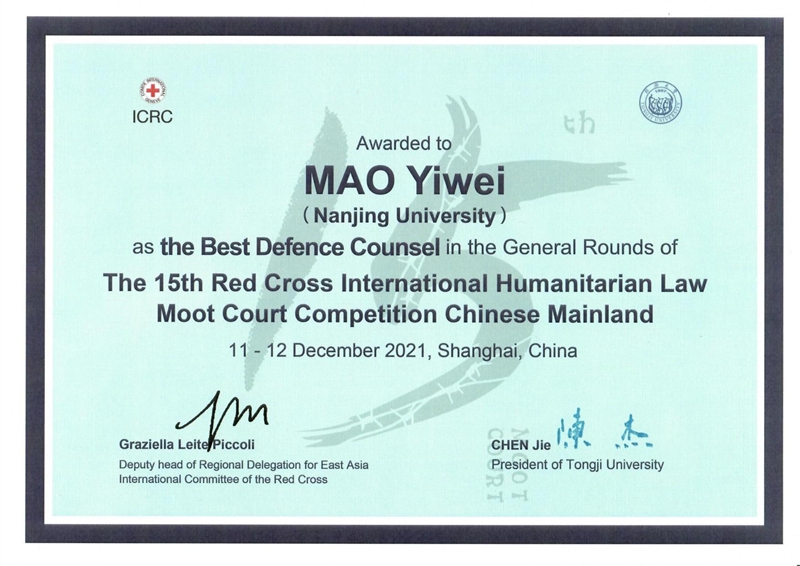 在“国际人道主义法模拟法庭”(IHL MOOT COURT)赛事上具有优秀的历史成绩,曾经四次荣获团体总分一等奖(总分前八),四次荣获团体总分二等奖,获得过一次冠军(联合组队)和一次亚军,共有3名同学获得“个人单项冠军”。国际人道主义法模拟法庭的实战演练展现了南大法科学子的专业素养,也体现了涉外型卓越法律人才实验班的培养成果。