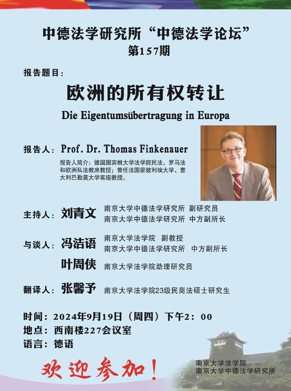 2024年9月19日,应南京大学中德法学研究所邀请,来自德国图宾根大学的Thomas Finkenauer教授为第157期“中德法学论坛”做了题为“欧洲的所有权转让”的学术讲座。