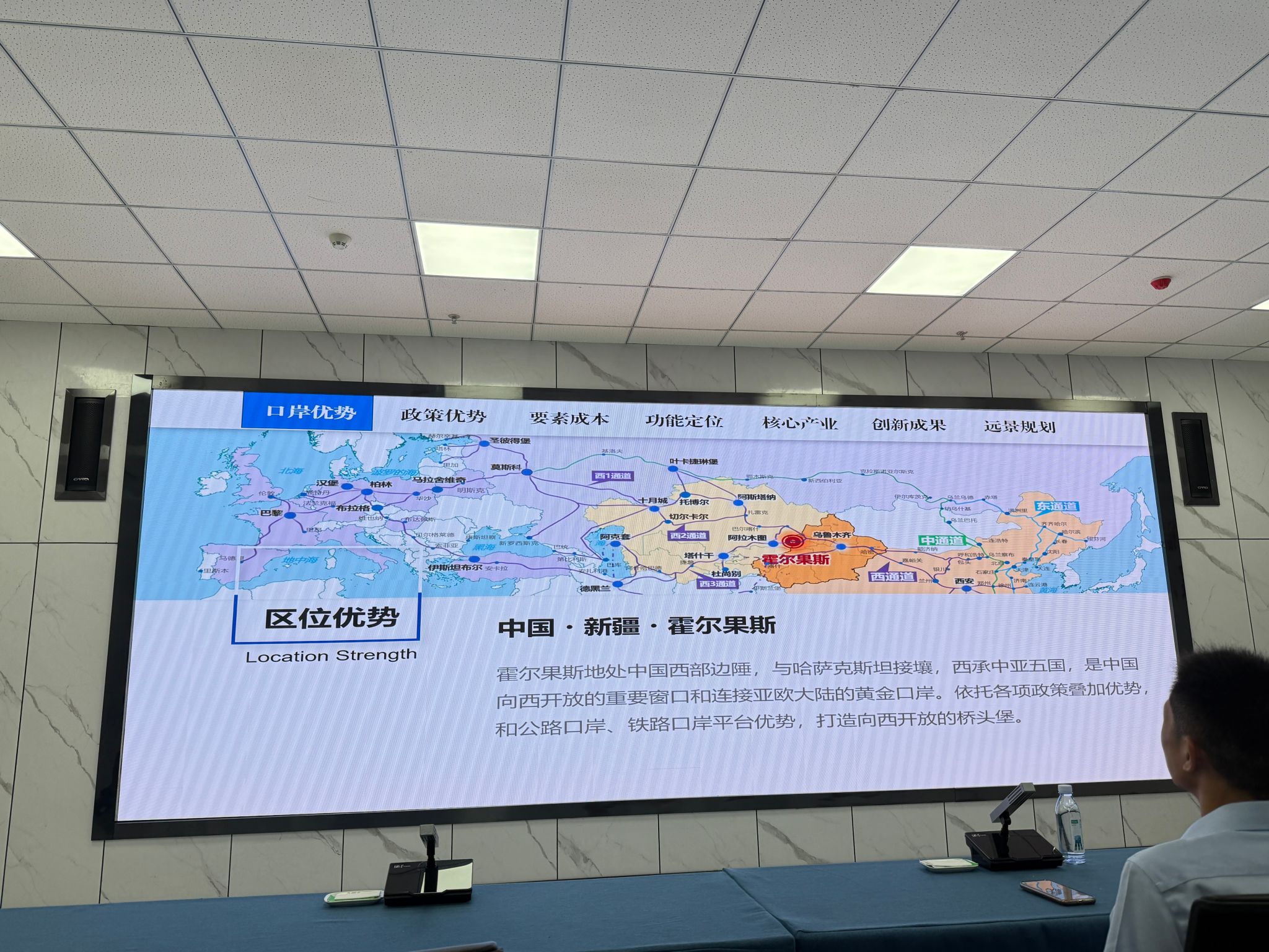 调研团队首先来到霍尔果斯第六代国门,听取了工作人员对霍尔果斯市的基本情况介绍。霍尔果斯历史悠久,地处欧亚经济板块中心,隋唐时期便是古丝绸之路北道重要驿站,1881年设立口岸。如今,霍尔果斯向东连接中国内陆,西侧毗邻中亚五国,已发展成为集边境区、口岸城、商贸型、国际化特点为一体的综合性城市。霍尔果斯目前市辖区面积1910.98平方公里,近期有望进一步扩容。13个民族和谐生活在霍市地区,多元文化在此碰撞和交融。