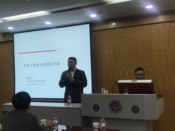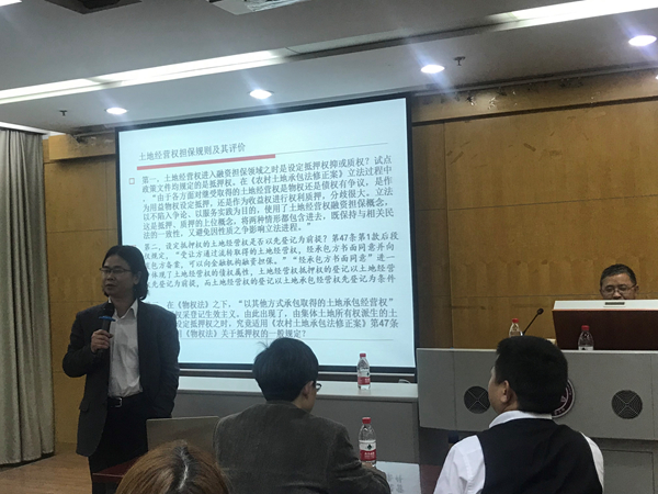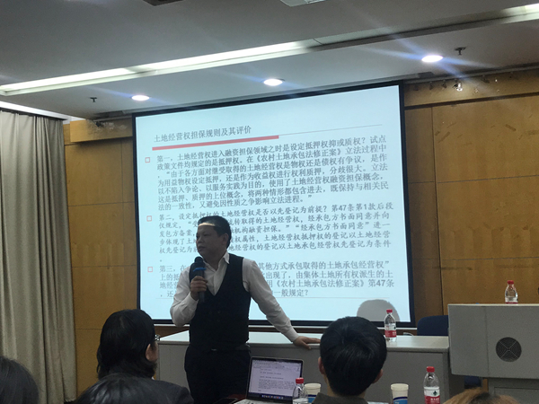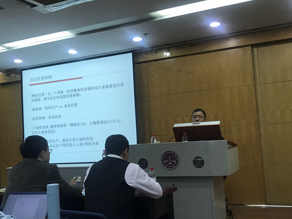高圣平教授首先介绍了三权分置学说的背景知识,在两权分离的模式不能满足现有农村经营的需要的背景下,三权分置这一政策在中央的指导下被提出。学界对三权分置的三权仍有歧义,立法采纳了“土地所有权+土地承包经营权+土地经营权”之内涵。高圣平教授接着以立法参与者的身份向我们介绍了立法的进程,及其具体的修改条文和个中原因。三权分置,概而言之是立法在原有两权的基础上增加了土地经营权。紧接着,高教授对土地承包经营权规则的修改和土地经营权规则的修改与增设分别给出了自己的看法。高教授认为土地承包经营权对身份属性的强调,体现了其社会保障的功能,保障承包农户不丧失土地承包经营权,而市场化的部分则交由土地经营权去表达。立法中把对“荒山、荒沟、荒丘、荒滩等农村土地”的权利归于土地经营权,而不再将其认定为土地承包经营权,进一步明确了土地承包经营权的身份属性,保持立法的前后统一。对于土地经营权,立法说明予以淡化,学界对此争议很大,高圣平教授也不认可立法的这一模糊处理方式。而对于土地经营权担保规则的规定,立法使用了土地经营权融资担保概念,是抵押和质押的上位概念。由此引发土地经营权的担保物权究竟是抵押权还是质权的问题,学界对此尚存疑惑。高教授认为,设立担保后原权利人还能行使对土地的权利则该行为是抵押,如若不能行使则为质押。