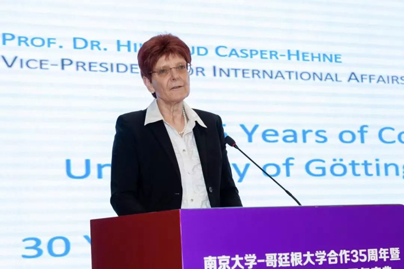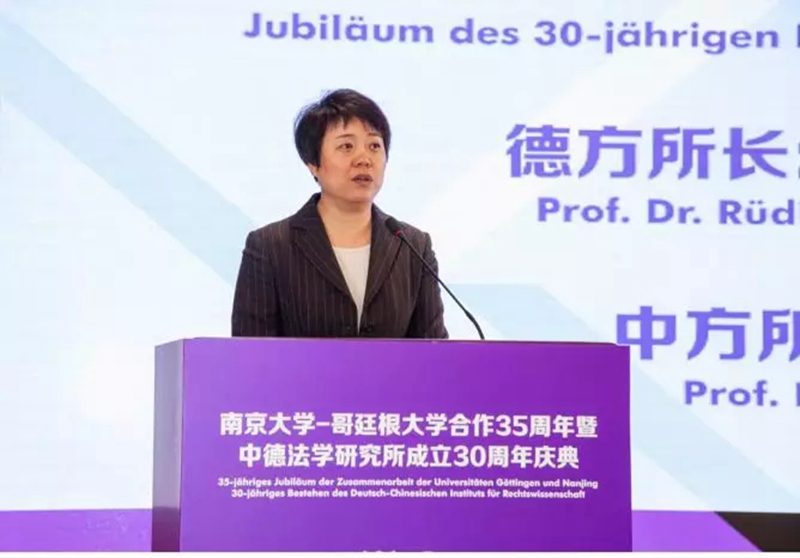 哥廷根大学副校长何艾烨在致辞中代表哥廷根大学欢迎德国驻中国大使馆、基金会、中国社会科学院和其他院校的代表等来宾的到来,共同欢庆两校过去35年富有成效的深度合作及中德所成立30周年。何副校长追忆了2014年在哥廷根举行的30周年庆典,并对南京大学民乐团的演出表示了赞赏与感谢。何副校长表示,中国长期以来都是哥廷根大学国际交流的重点,两国在很多方面展开了深度合作。两校有四个共同的双学位硕士项目和大量共同科研项目,南京大学是哥廷根大学真正意义上的战略性伙伴。何副校长进一步肯定了中德法学研究所的里程碑意义和灯塔效应,她表示,正是上世纪80年代中德法学研究所的成立,开启了双方的合作交流,这是中德学界机构化合作的创举。35年以来,双方的合作拓展到了多个领域:中德法学研究所、跨文化比较研究所、中德社会计算学院、中德法双学位项目、中德法学比较(针对非中国籍学生)、跨文化学(哥廷根大学、南京大学、北京外国语大学)以及北京外国语大学与哥廷根大学共同建立的孔子学院。合作不仅限于人文社科,还遍及医学、生物、地质、古生物学等各种领域。双方将进一步拓展合作关系和合作专业的多样性、可持续性,而这与双方之间的信任是分不开的。最后,何副校长祝愿两校合作能取得更大成效,进一步加深相互理解与交流。