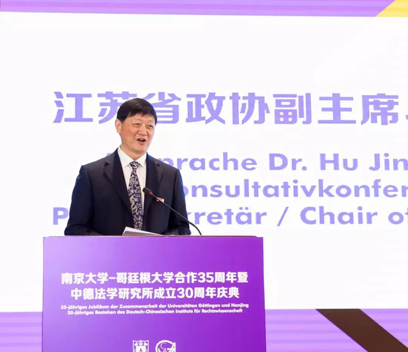 庆典首先由江苏省政协副主席、南京大学党委书记胡金波致欢迎辞。胡书记对各位贵宾的到来表示衷心的感谢。他首先追忆了南京大学与哥廷根大学35年来辉煌的合作成果,赞扬两校的合作已成为中德两国高水平人才培养和高层次人文交流的合作典范。中德法学研究所已成长为中国最重要的法学研究基地之一,不仅科研成果颇丰,而且成为了两国学者从事德国法、欧盟法、中德法律比较和中欧法律比较研究的高端平台,为中国法治建设和中德两国的法律文化交流作出了重要的学术贡献。胡书记对研究所的人才培养意义尤为肯定。研究所不但为法学界输送了大量专业人才,而且承担着两国教育领域乃至民间外交的重要使命。在进一步改革开放和“一带一路”的大背景下,南京大学将进一步深化与哥廷根大学的战略合作,推动两国教育交流。最后,胡书记预祝本次庆典取得圆满成功。