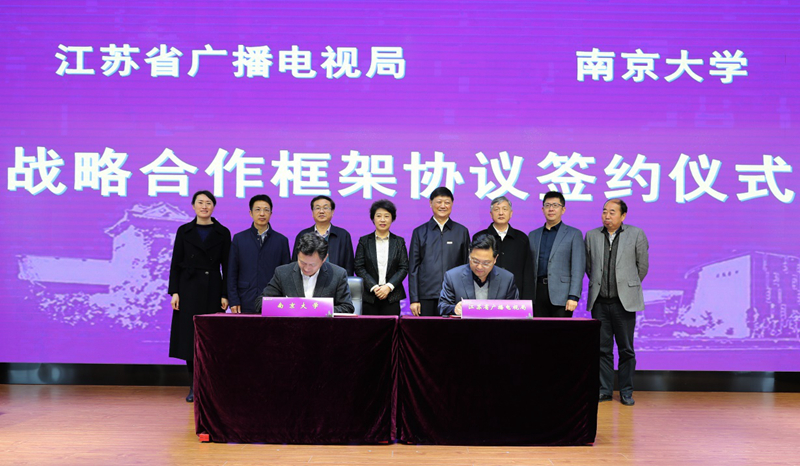 11月23日上午,江苏省广播电视局与南京大学战略合作框架协议签约仪式在我校鼓楼校区举行。双方将在人才交流培养、高端智库打造、精品创作生产、媒体融合发展、基地(园区)建设等方面全方位深化交流合作,加快推动江苏广播电视和网络视听行业高质量创新性发展。校党委书记胡金波,江苏省广播电视局党组书记、局长缪志红出席仪式并致辞。校党委常委、副校长邹亚军,校党委常委、党委办公室主任、组织部长、统战部长王明生,省广播电视局党组成员、副局长吴以桥,省广播电视局党组成员、副局长尹晓平参加仪式。仪式由省广播电视局党组成员、副局长于国民主持。