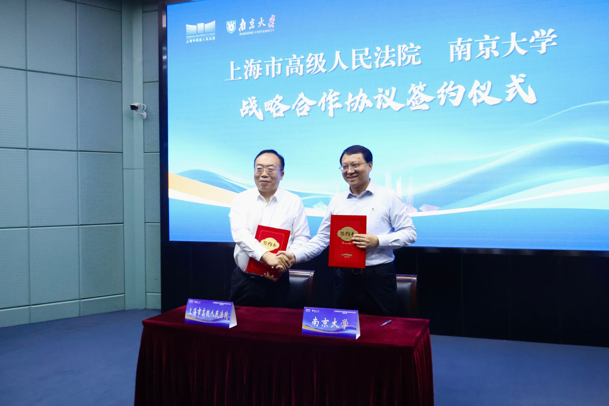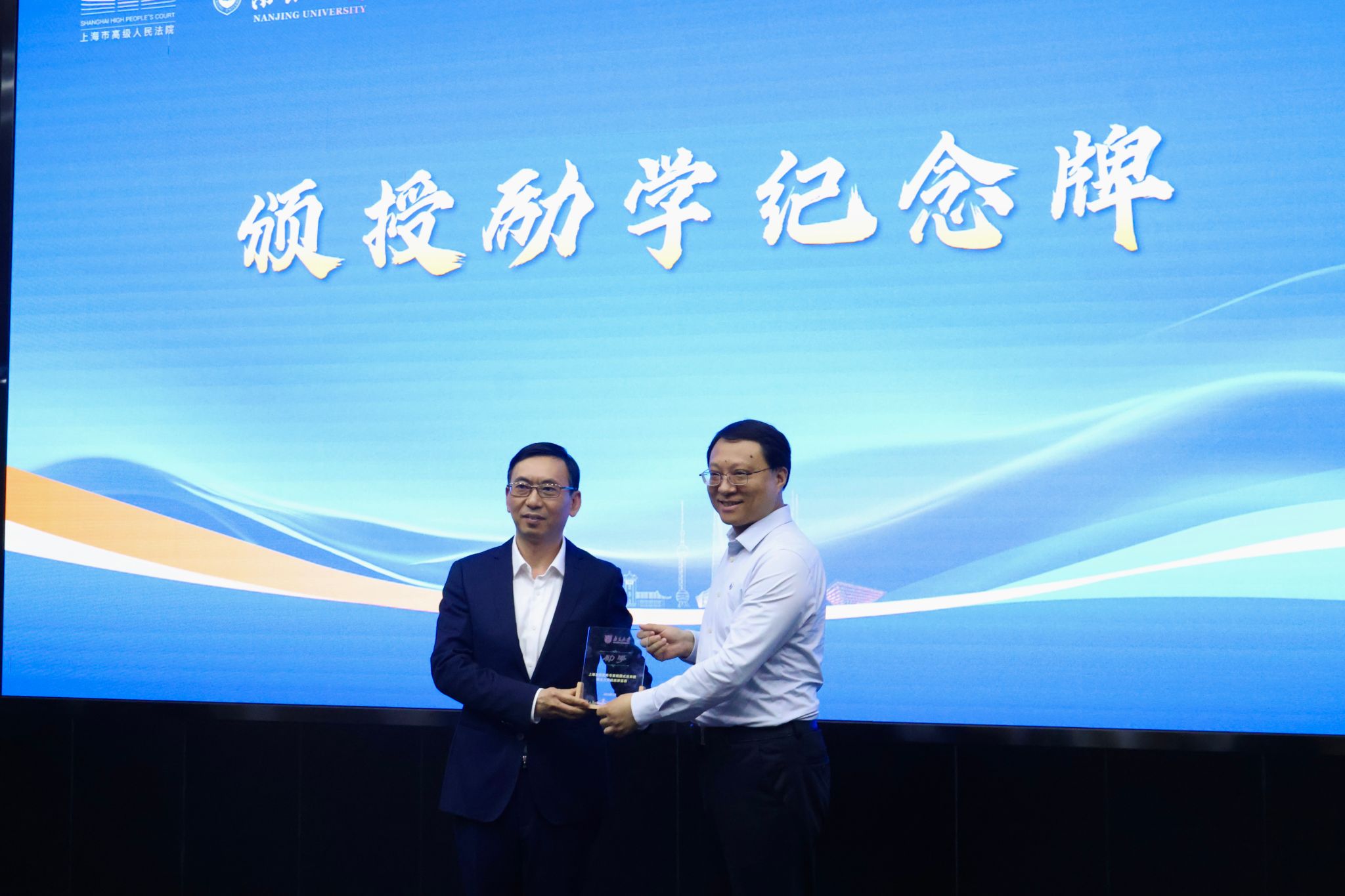 上海市高级人民法院党组成员、政治部主任王理秋与南京大学党委副书记陈云松分别代表上海市高级人民法院和南京大学签订了战略合作协议。林晓镍副院长、王理秋主任、陈云松副书记、孙乐强部长共同启动“上海法院实务专家组团式进高校·南京大学巡讲活动”仪式,标志着涵盖十大核心领域的系统性机制化合作正式启航。陈云松副书记为林晓镍副院长颁授励学纪念牌,“励学”二字取自南京大学校训,蕴含着南京大学对上海法院的衷心感谢与未来合作取得更大成果的殷切期盼。