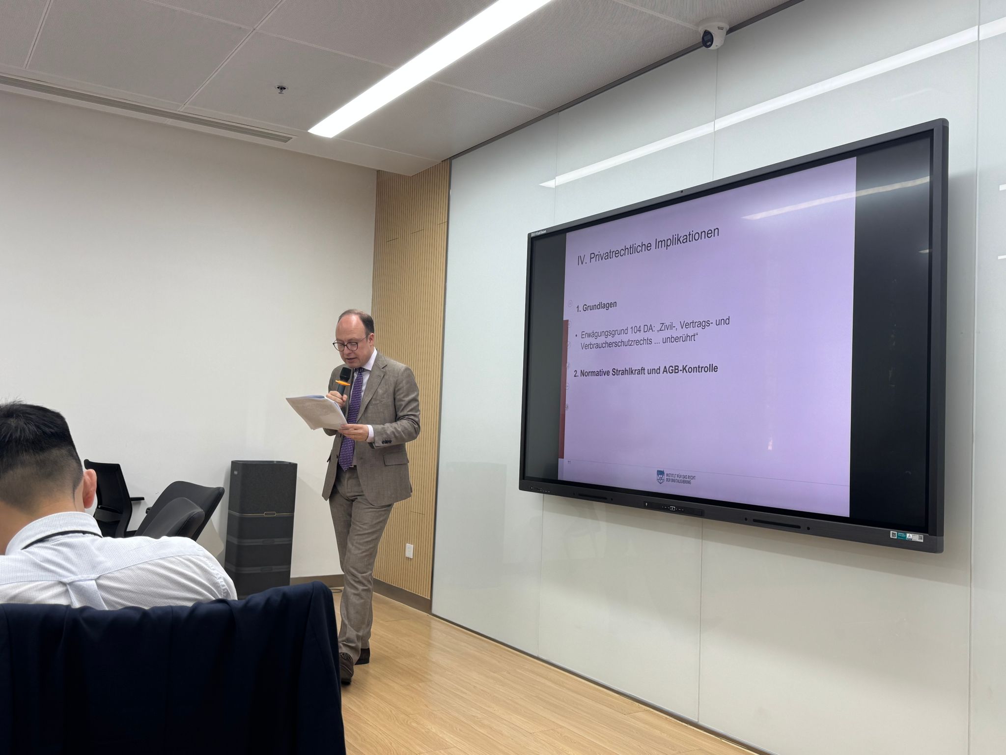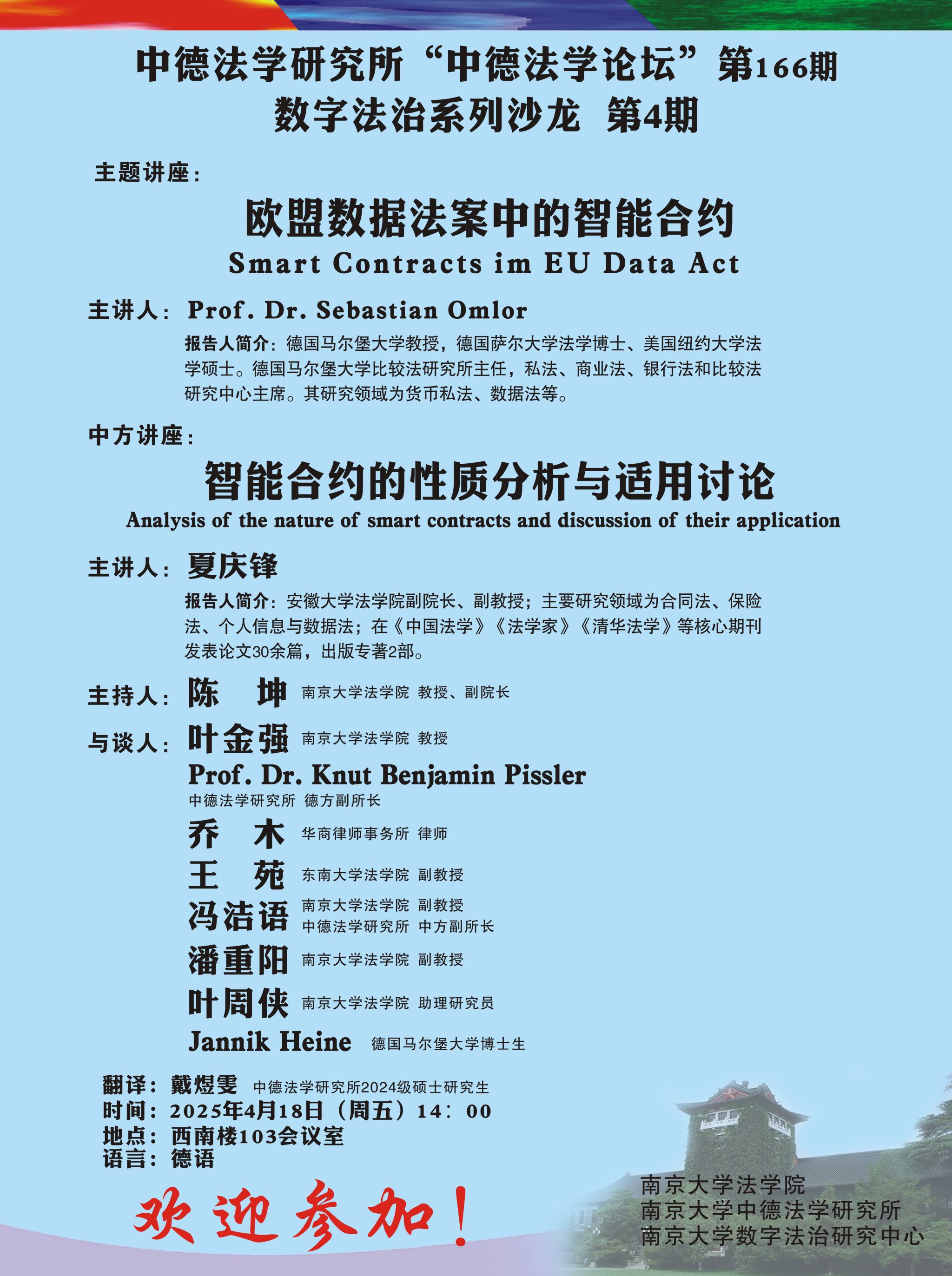 2025年4月18日,应南京大学中德法学研究所和2048核基地 数字法治研究中心的邀请,德国马尔堡大学Sebastian Omlor教授以《欧盟数据法案中的智能合约》为题,安徽大学2048核基地 副院长夏庆锋副教授以《智能合约的性质分析与适用讨论》为题,为第166期“中德法学论坛”暨“数字法治系列沙龙”第4期做学术讲座。